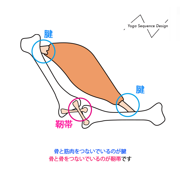 端的にいうと、腱は筋肉と骨を繋ぐ組織、靭帯は骨と骨を繋ぐ組織です。腱は水分量が少なく、筋肉ほどの伸縮性がありません。そのため、オーバーストレッチにより損傷しやすく、痛みが出ることもよくあります。これらの組織を守りながらヨガのレッスンをするためには、しっかり筋肉を使い関節への過負荷を防ぐ必要があります。