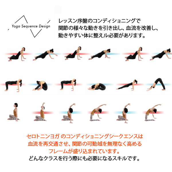 ヨガシークエンスデザインやセロトニンヨガのコンディショニングシークエンスは血流を再交通させ、関節の可動域を無理なく高めるフレームが盛り込まれています。どんなクラスを行う際にも必要になるスキルです。