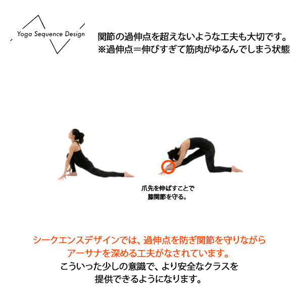 ヨガシークエンスデザインやセロトニンヨガのシークエンスは、例えばハーフハヌマーサナで爪先を伸ばすなど、過伸点を防ぎ関節を守りながらアーサナを深める工夫がなされています。