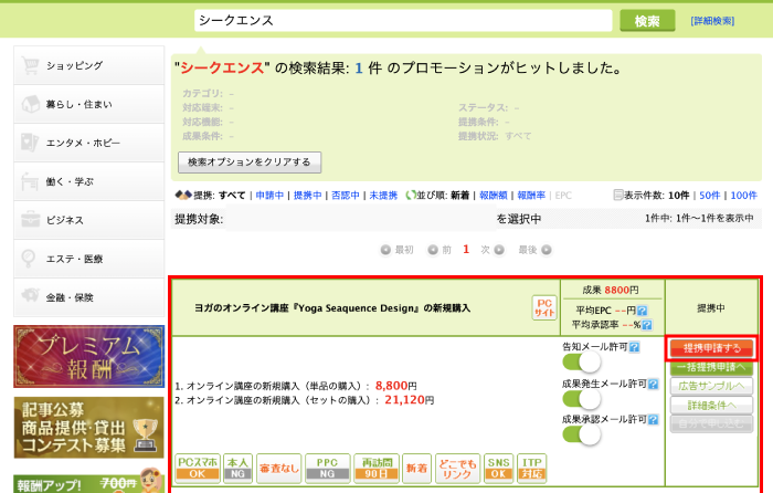 ヨガシークエンスデザインの右側の赤いボタン「提携申請する」をクリックし、提携をおこないます。