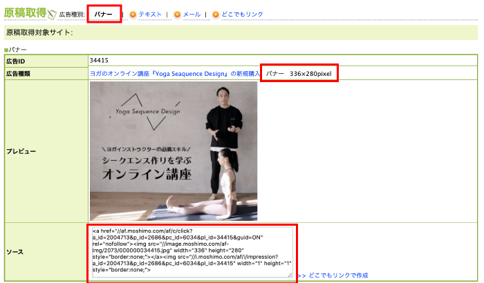 使いたい広告が決まったら「ソース」をそのままコピーします。