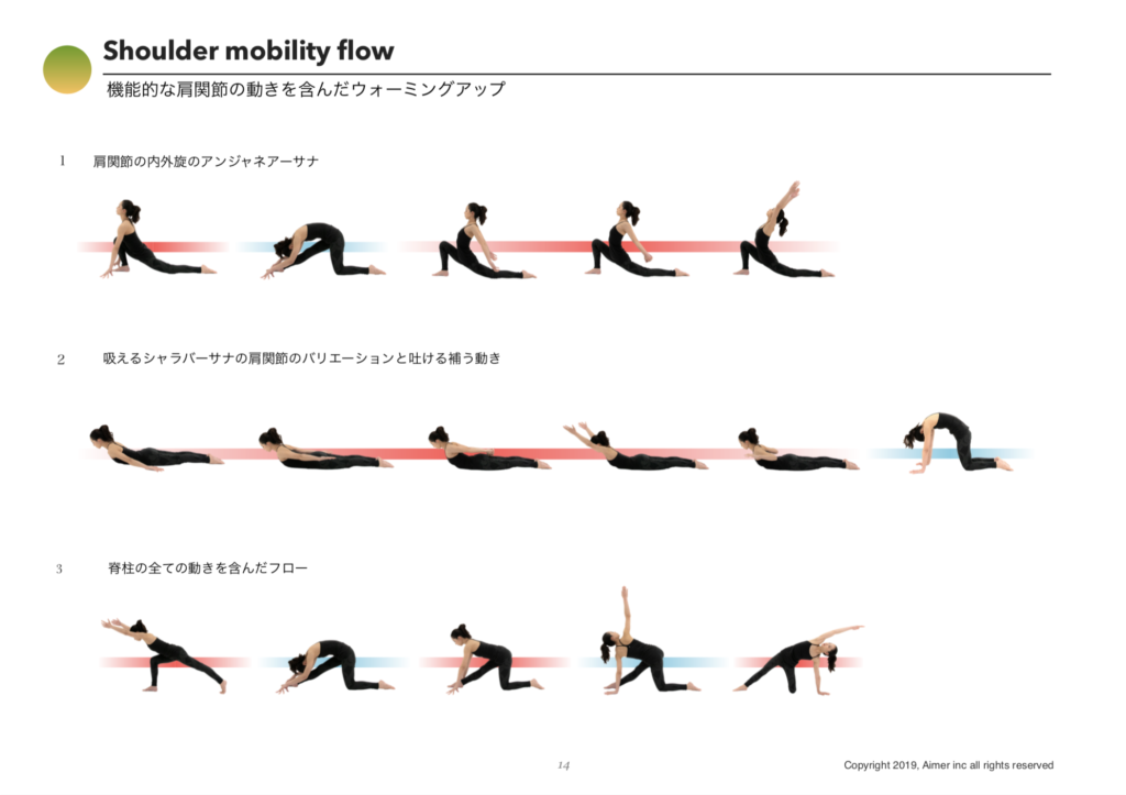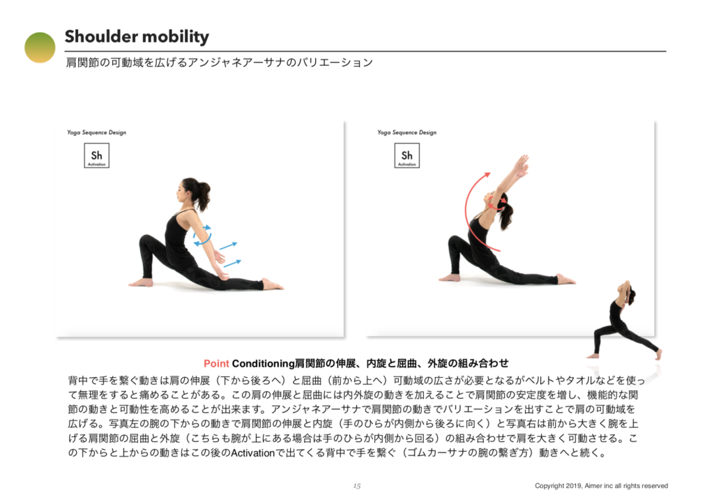 またクラスをコンディショニング(ウォーミングアップ)、アクティベーション(スタンディング)、リラクゼーションと3つのフェーズにカテゴライズすることでどのタイミングでどのような構成をするかの理解が深まります。