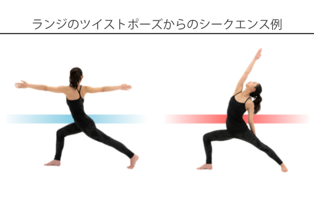 吐けるポジションであるランジのツイストポーズから、吸えるポジションであるリバースウォーリアに入るシークエンス。