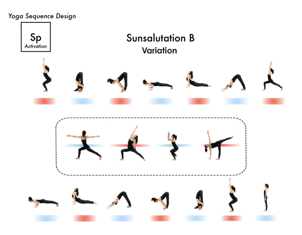 このように、ベーシックな太陽礼拝の流れに組み込める3~5個くらいのアーサナをつないだ節をレパートリーとしてストックしておくと、効果的なシークエンスを状況に合わせて組むスキルがアップしますよね。