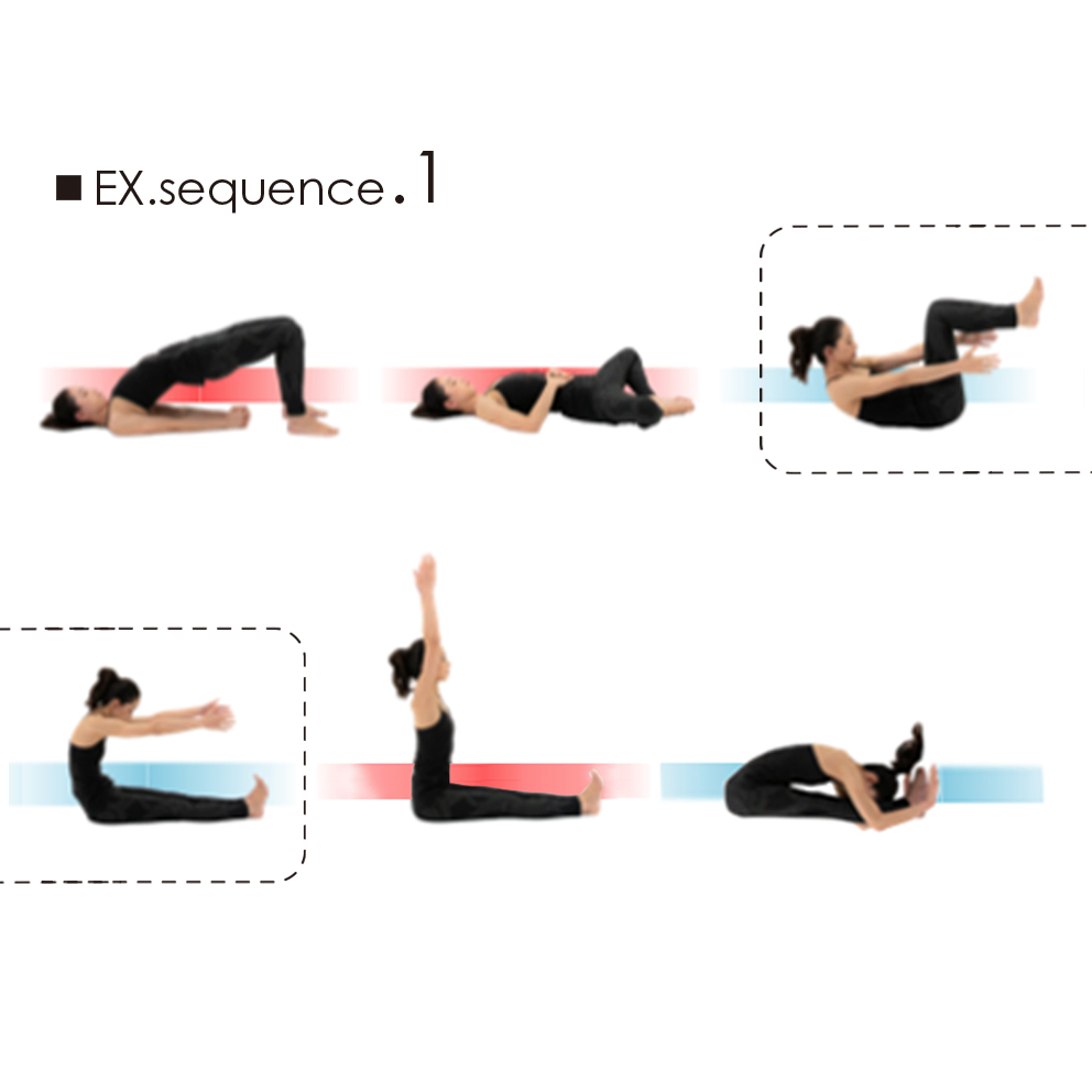 セーツバンダアーサナからパスチュモッターナーサナへ移行するシークエンス例です。合蹠の仰向けで腰、股関節を緩めた後、腹部を引き締める体勢で背筋を弛緩させ、ダンダーサナで骨盤を立てやすくなるように調整しています。