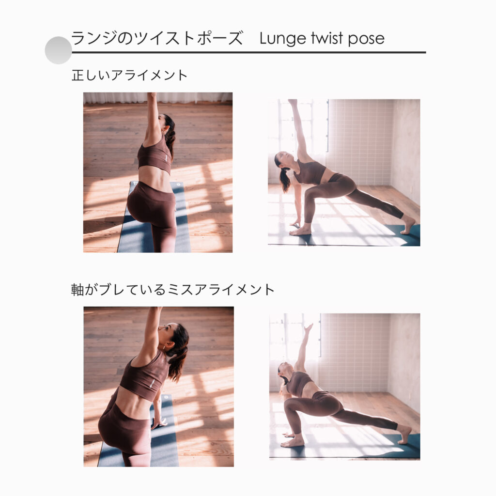また、行う頻度の高いランジのツイストポーズでは、起こりがちなミスアライメントに注意を払わないと、自律神経への呼吸の作用も変化してしまいます。