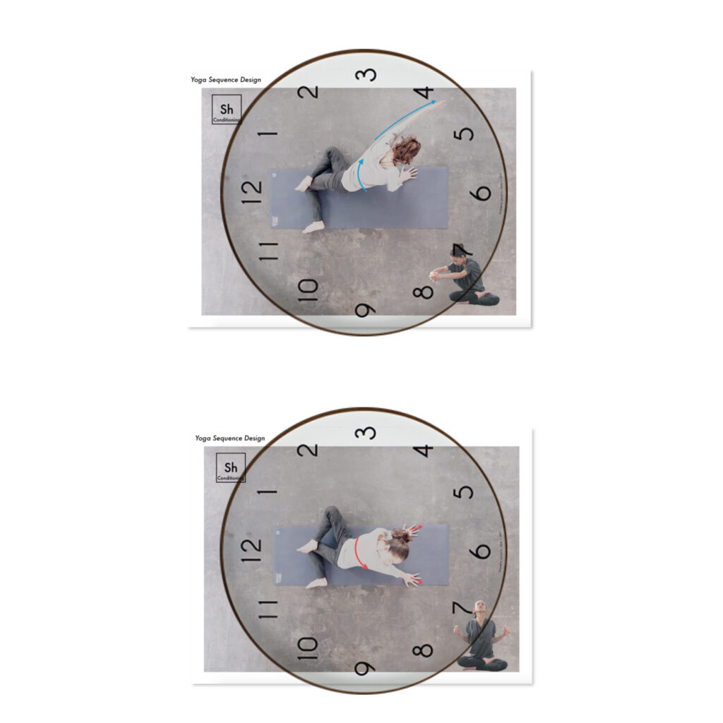 レッスンの冒頭で、共通認識としてマットの前が12時、後ろが6時、という共通認識を受講生に伝えることで、方向性へのガイドが格段に楽に、そして正確になります!
