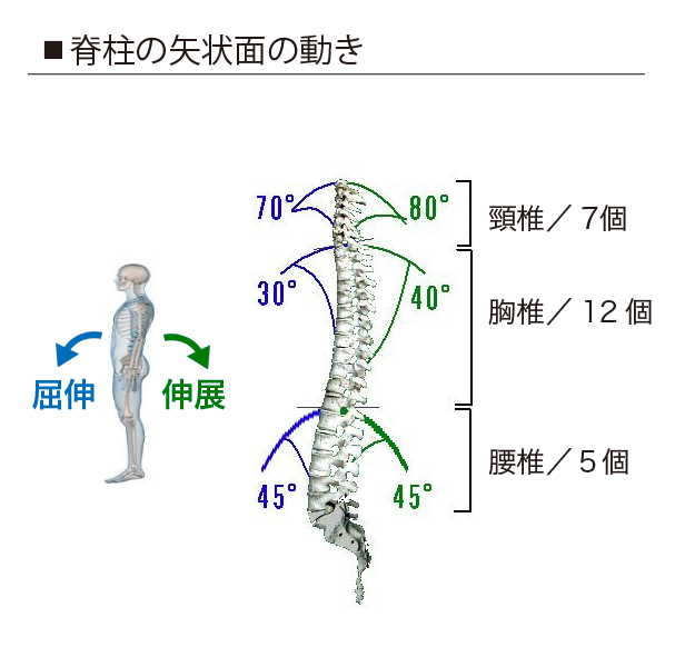 ここでは復習も兼ねて頸椎、胸椎、腰椎それぞれが得意とする、脊柱の基本的な稼働範囲を確認してみましょう。