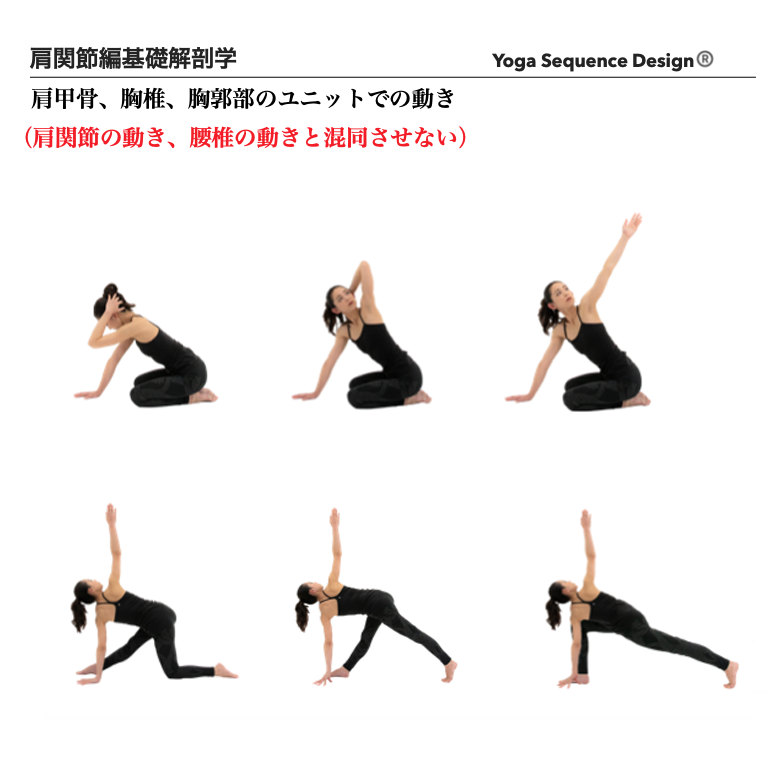 背骨の旋回を最も得意とする部分ですね。つまり、ここで肩甲骨の動き(腕の上げ下げ)により背骨の旋回を代償してしまわないように適切にナビゲーションする必要があります。