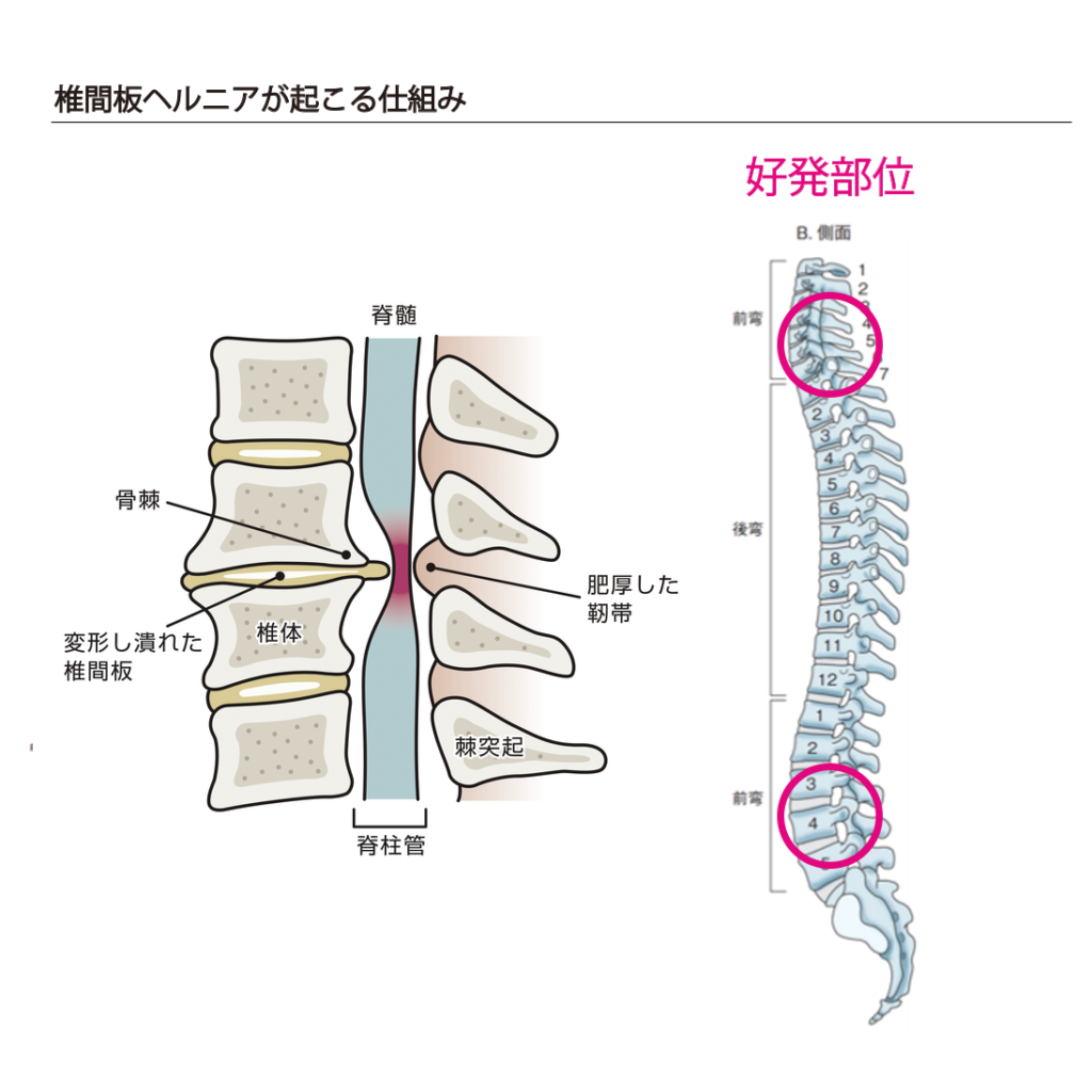 そしてこの椎間板ヘルニアは、元々が前弯している頸椎と腰椎の中でもさらに負担がかかりやすい箇所である
