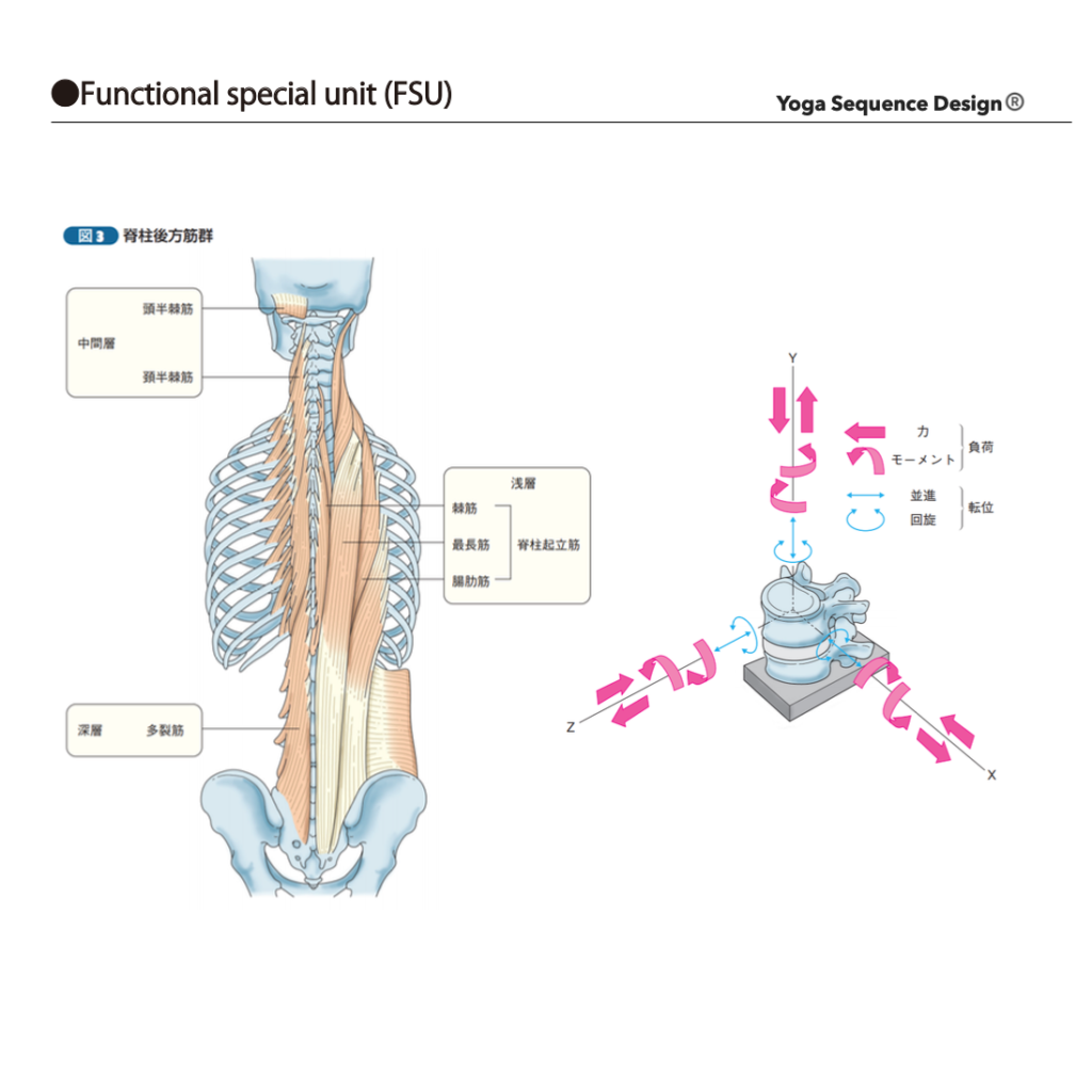 隣接する2個の椎骨とそれらを連結する椎間板、椎間関節、靭帯は脊柱運動の基本単位であり、Functional special unit (FSU)と呼ばれます。