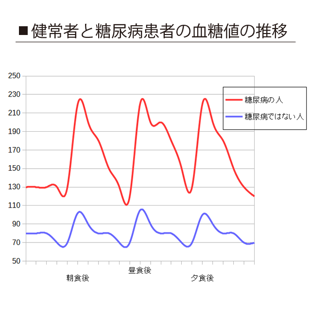 空腹時の血糖値が正常範囲であり、糖尿病の診断を受けていない人でも、食後に150 mg/dL以上に上昇している人もいます。