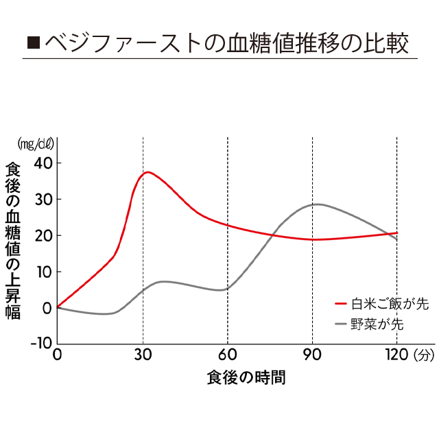 空腹の状態から急にこのような食事を取るのではなく、最初にGI値が低く血糖値の上昇を緩やかにする食物繊維を多く含んだ野菜類を食べるなど、少しの工夫でも食後高血糖を改善していくことができます。