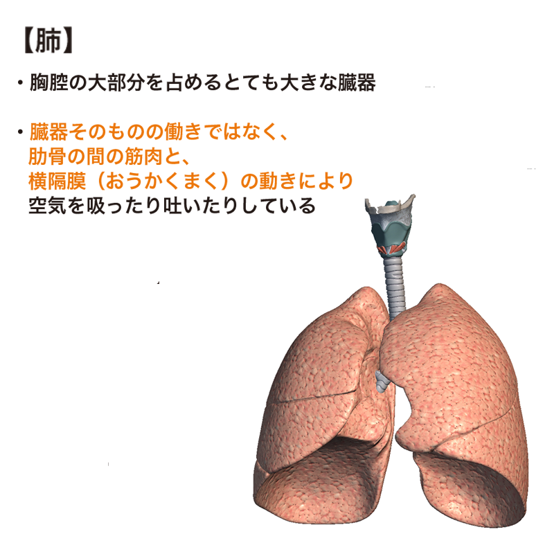 肺は臓器そのものの働きではなく、肋骨の間の筋肉と、横隔膜(おうかくまく)の動きにより空気を吸ったり吐いたりしています。
