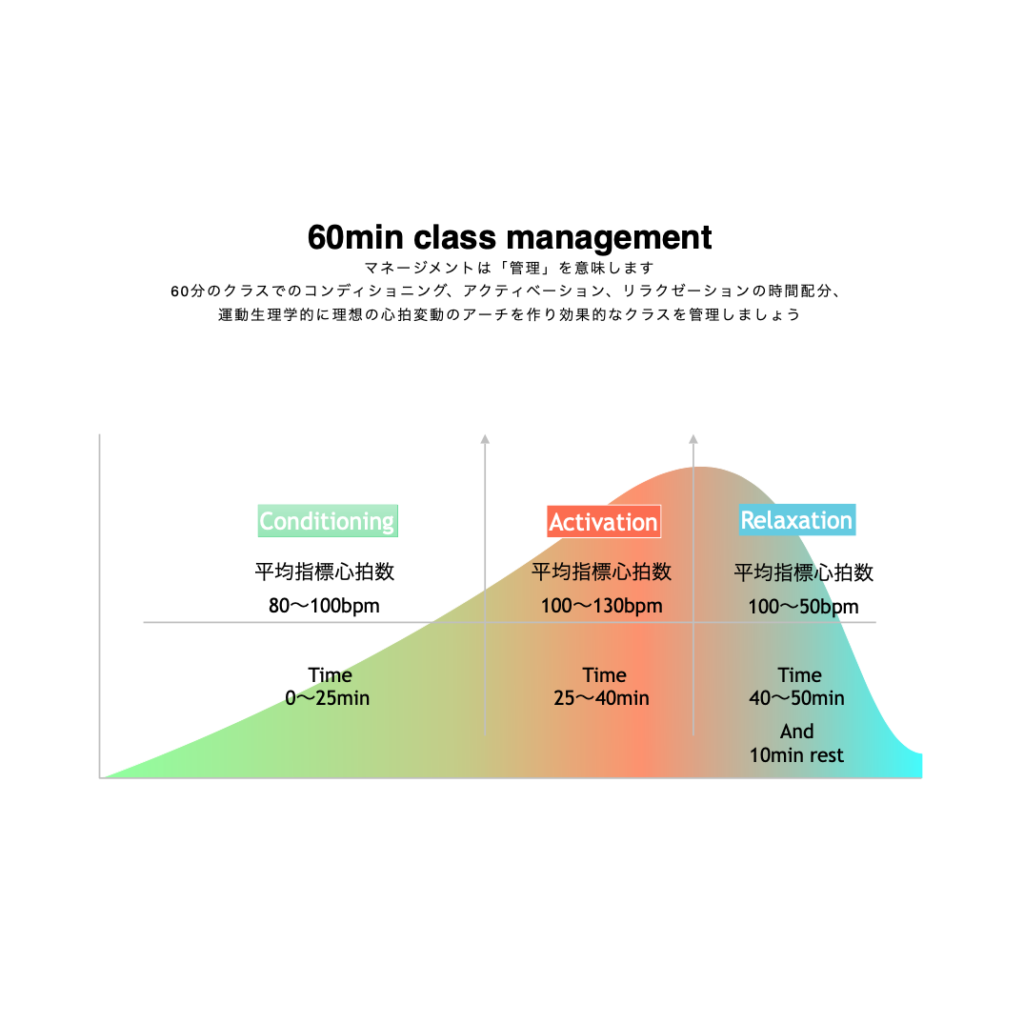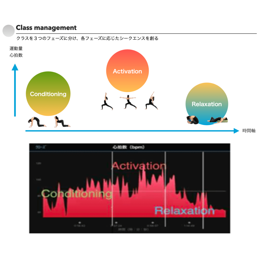 特にリラックスヨガなどの場合は、ついついアクティベーションの強度や時間を落としがちですが、リラックスへ導くためにも一定以上の運動強度を持たせることは最終的な満足感のためには欠かせません。