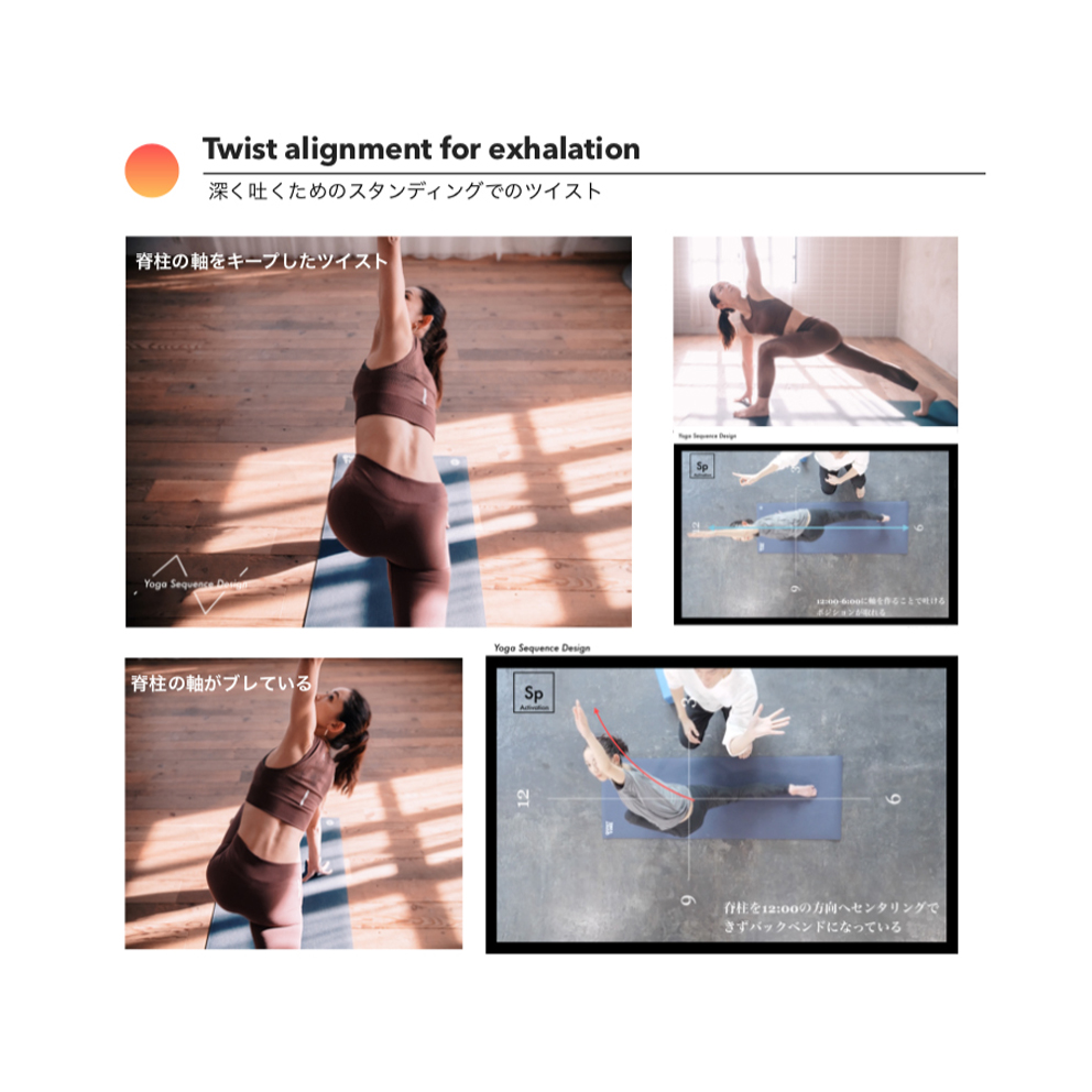 今回ご紹介したランジのツイストなどは、立位での脊柱の付け根からの深いツイストであり、より腹筋群が引き締まりやすく強度の高いアーサナです。心拍を上げていくアクティベーションで取り入れると、呼吸を効果的に深められます。