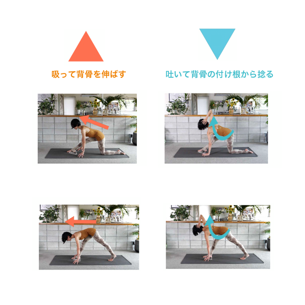 捻りのアーサナ は吐けるポジションですが、捻りに入るまでに必ず「吸いながら背骨を伸ばす」このように導くことで、脊柱全体の正しいツイストを深めていくことができます。