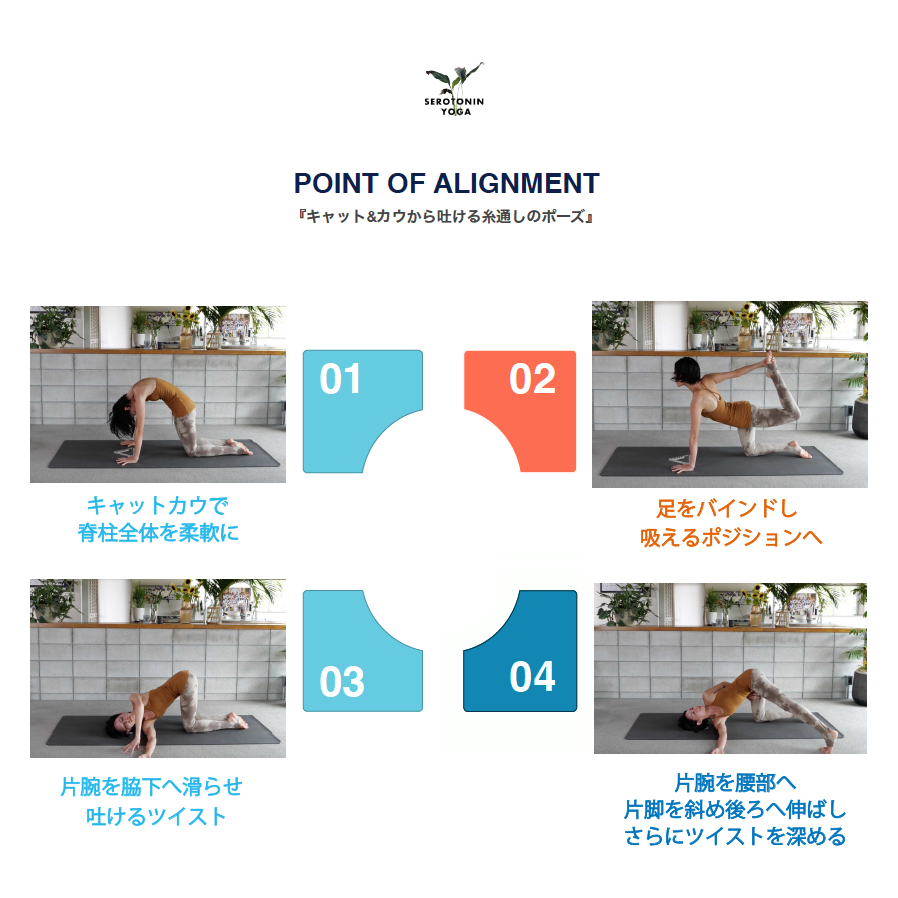 というように、何気なく一気に流すのではなく、段階ごとにそのポジションで優位な呼吸を体感させながら進めていくことで、より呼吸を深めていくことができます。