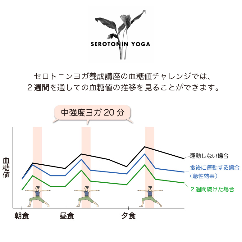 ヨガシークエンスデザインの理念をもとに組まれたセロトニンヨガのシークエンスは、精神安定ホルモンのセロトニンの分泌だけでなく、ストレスホルモンであるコルチゾールをとても高いレベルで抑制することが証明されています。ストレス耐性をつけることは、糖質への過剰な欲求を抑制し、自律神経を整え食欲を正常に保ちます。