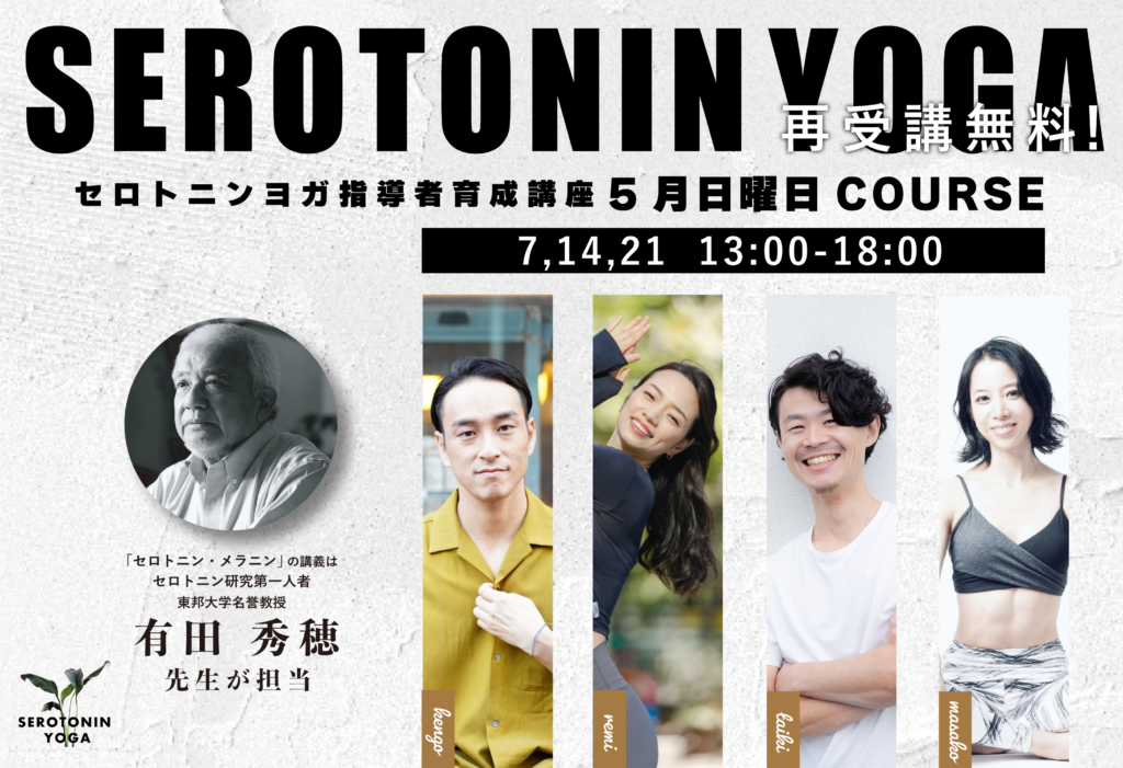 【セロトニンヨガ】セロトニン研究の第一人者有田秀穂氏(東邦大学名誉教授)が『セロトニンの分泌に効果的な身体運動を含んだヨガプログラム』として日本で初めて認証された。呼吸を深めるヨガの野村賢吾先生のさらに新しいヨガの形です。