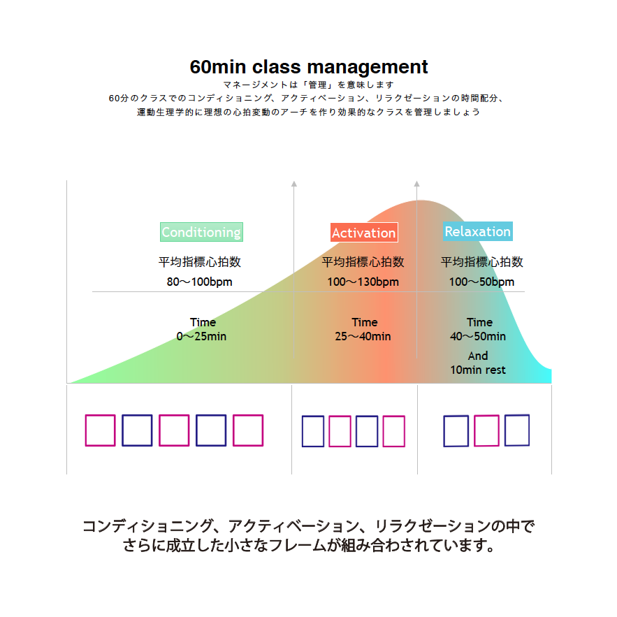 大枠としては体をほぐし徐々に心拍を上げていくコンディショニング、最も心拍が上がるアクティベーション、心拍を下げていくリラクゼーション、の三つのパートに分かれており、それぞれが吸えるポジションと吐けるポジションの配置が理にかなっている成立したフレームで構成されています。