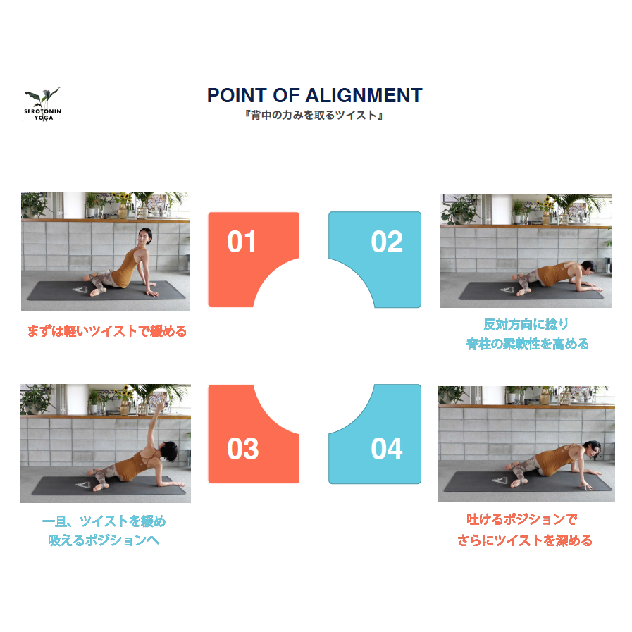 ・吐けるポジションにて反対方向にツイストし、背骨一節一節を柔軟に