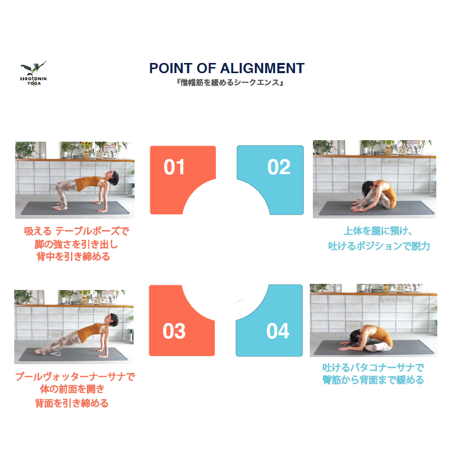 僧帽筋や菱形筋といった背面の筋肉は緊張が残りやすく、しっかり緩めることで後のリラックスへ導きやすく、ダウンドッグで腰部を伸ばしやすくなるなど、アクティベーション以降のレッスンの質に大きく影響してきます。