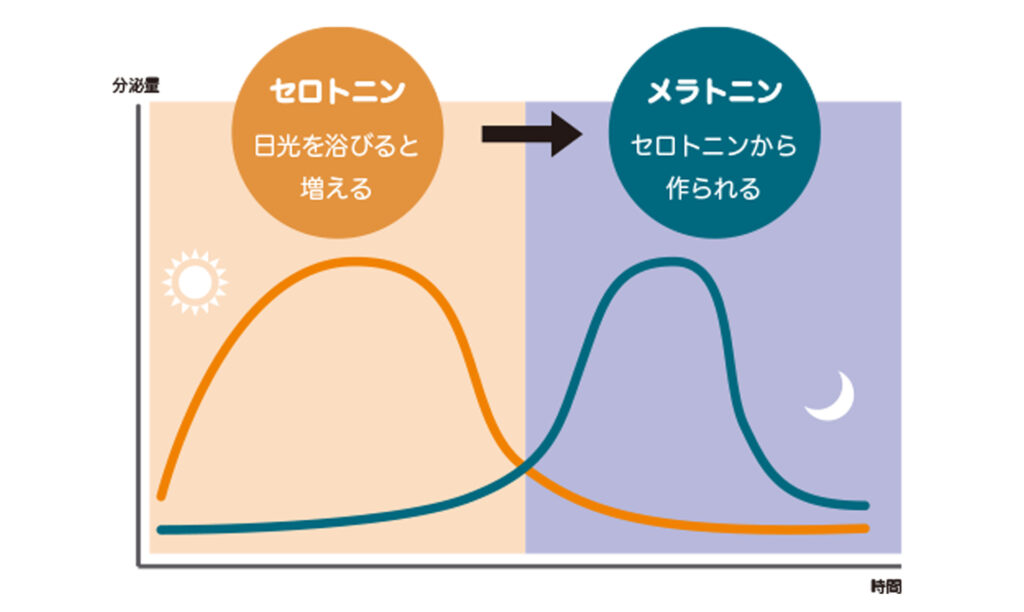 実は睡眠の質にもセロトニンは大きく関与しています。午前中に分泌されたセロトニンは、夕方以降にかけてメラトニンという睡眠誘発ホルモンへと変わります。