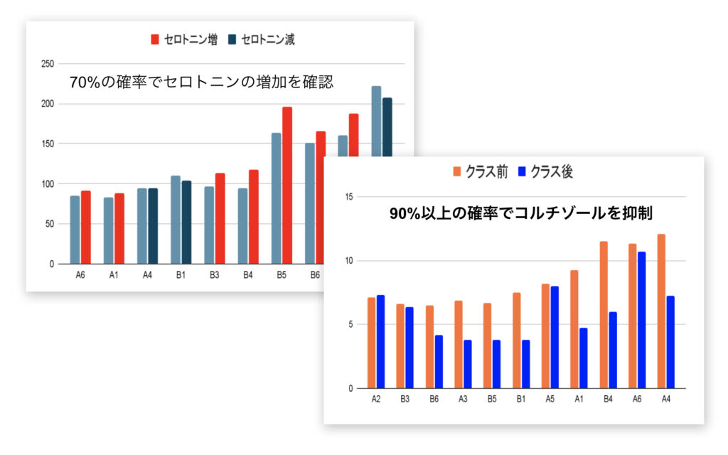 セロトニンヨガは実際にセロトニンヨガ実践前と後で被験者の血液を採取し、血液検査を行いました。それによりセロトニンの分泌とコルチゾール抑制の高い効果が証明されています。